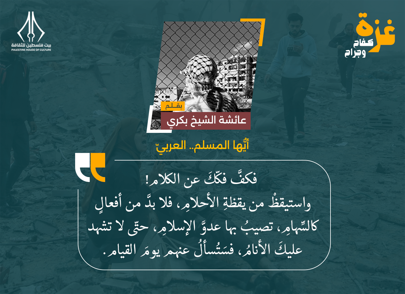 فكفَّ فكّكَ عن الكلام! واستيقظْ من يقظةِ الأحلامِ، فلا بدَّ من أفعالٍ كالسِّهامِ، تصيبُ بها عدوَّ الإسلامِ، حتّى لا تشهد عليكَ الأنامُ، فسَتُسألُ عنهم يومَ القيام.