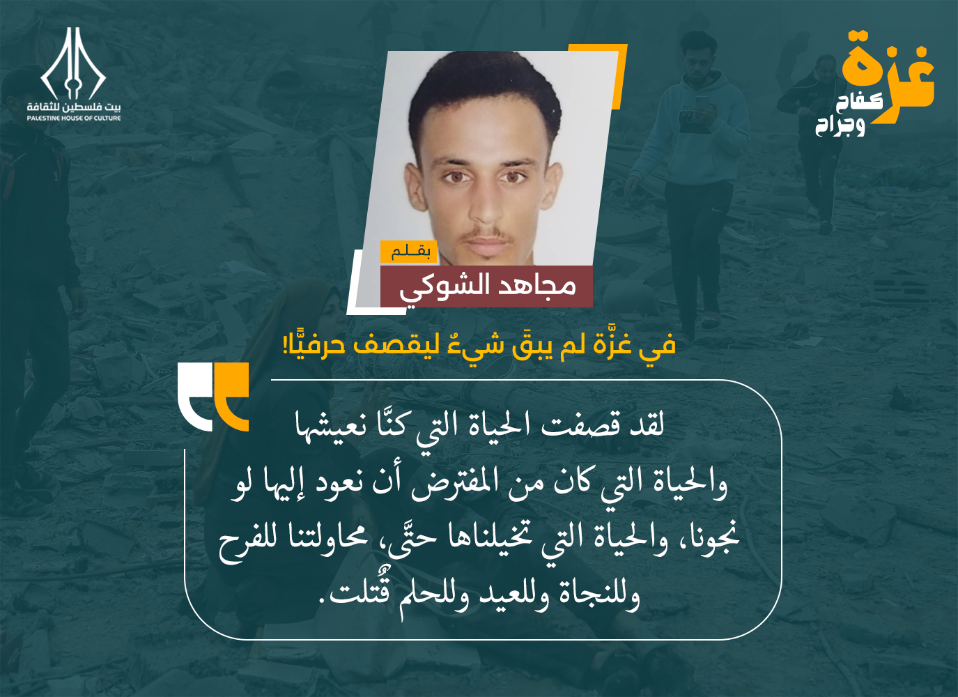 لقد قصفت الحياة التي كنَّا نعيشها، والحياة التي كان من المفترض أن نعود إليها لو نجونا، والحياة التي تخيلناها حتَّى، محاولتنا للفرح وللنجاة وللعيد وللحلم قٌتلت.